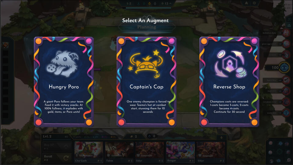 The process began with rough sketches and evolved through iterative icon design and interface layout exploration. The overall style and tone were inspired by the League of Legends’ April Fools skins, blending playful narrative ideas with functional UI design to create a cohesive and light-hearted TFT expansion.